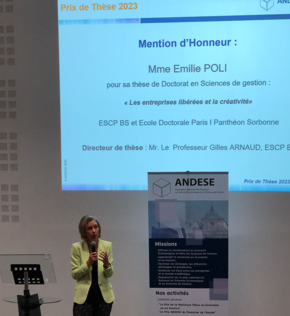La thèse d’Emilie POLI a également obtenu la mention d’honneur lors du Prix de thèse ANDESE 2023 – Sciences Economiques et Sciences de Gestion. Cette cérémonie, s’est déroulée sous le Haut Patronage de Madame la Ministre de l’Enseignement Supérieur et de la Recherche, Sylvie Retailleau. Etaient également présents Gérard Bekerman, Président de l’Afer, Daniel Bretonès, Président de l’ANDESE et le Professeur Jean-François Lemoine, Président de Jury.